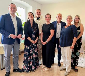 Landrat Christian Herrgott wünschte den beiden Sozialpädagoginnen des Mobilen Familienbüros, Sarah Rottenberg (2. v. links) und Judith Schnedermann (3. v. links), viel Erfolg für ihre neue Tätigkeit. Zur Eröffnung in Schleiz waren auch der Geschäftsführer der Arbeiterwohlfahrt des Saale-Orla-Kreises, Ulf Grießmann (hinten links), Bürgermeister Marko Bias sowie Regine Kanis vom AWO-Kreisverband und die Bereichsleiterin für Kinder- und Jugendhilfe in der AWO, Victoria Pomsel, gekommen.