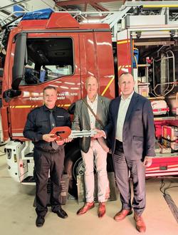 (von rechts) Landrat Christian Herrgott und Bürgermeister Jan Wißgott bei der Übergabe des symbolischen Schlüssels zur neuen Drehleiter an Stadtbrandmeister Uwe Eitner.