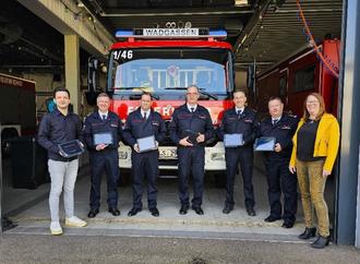 Tablet-Übergabe an (v-l.n.r.) Michael Maringer (LBZ Werbeln), Dirk Schirra (LBZ Differten), Klaus Mirold (LBZ Friedrichweiler), Andreas Lubjuhn (LBZ Mitte), Wehrführer Guido Hübschen, Vera Mayer, (Ordnungsamt/Feuerwehr)