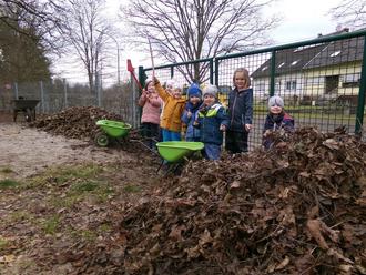 Hausmeister Ralf kam zu uns in den Kindergarten um den Spielplatz vom Laub zu befreien. Schon beim Ankommen mit Schubkarren, Schaufel und Rechen wurden die Kinder ganz neugierig. Zuerst wurde Ralf genaustens bei seiner Arbeit beobachtet und dann kamen auch schon die ersten Kinder und sagten : „Wir wollen helfen“ Mit eigenen Gerätschaften wie Schubkarren, Rechen, Schaufeln und Kipplader kamen sie herangeeilt und halfen Ralf beim Laubsammeln. Mit viel Engagement und Tatkraft entstanden in kurzer Zeit zwei riesengroße Laubhügel, die später in einen Anhänger geladen und abtransportiert wurden. Das Ergebnis konnte sich sehen lassen, der Spielplatz war wieder picobello. Die Kinder stellten fest, dass man durch die Zusammenarbeit viel schneller zum Ziel kommt. „Zusammen sind wir stark!“ das Motto der Kinder.