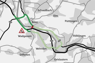 Für den Verkehr in Fahrtrichtung Wadgassen gelten folgende Umleitungsstrecken: