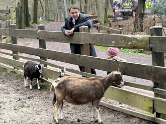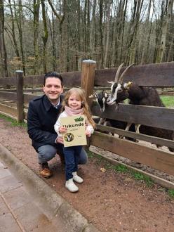 Zum Abschluss noch eine schöne Begegnung der Tochter des Arquer Bürgermeisters Bénoît Roussel mit einer unserer neugeborenen Ziegen in unserem Wildpark. Bénoîts Tochter, die vierjährige Léa erhielt von uns als Geschenk eine Tierpatenschaft geschenkt. Natürlich mussten wir noch kurz vor der Abreise das Patenkind besuchen.