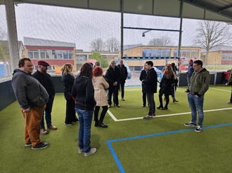 Danach durfte natürlich auch der Blick in eine unserer neusten gemeindlichen Errungenschaften, die proWin-Arena, nicht fehlen. Sehr interessiert wurde das Konzept unserer online buchbaren Freilufthalle aufgenommen und manch ein Delegationsmitglied hatte es sich nicht nehmen lassen, einmal einen Schuß auf das Tor zu wagen und dabei seine Schussgeschwindigkeit ausweisen zu messen.