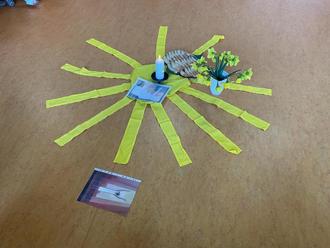 Mit bunten Tüchern, Bildern und den Symbolen legten sie Schaubilder zu den verschiedenen Stationen, erst in den Gruppen und dann für alle Besucher der Kita im Eingangsbereich.