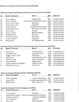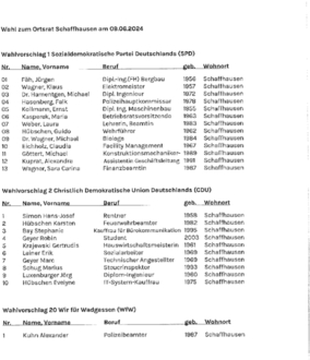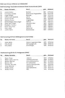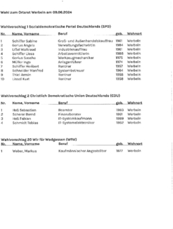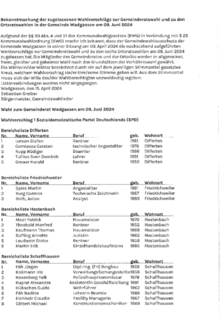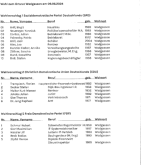 Aufgrund der §§ 30 Abs. 4 und 51 des Kommunalwahlgesetzes (KWG) in Verbindung mit § 25 Kommunalwahlordnung (KWO) mache ich bekannt, dass der Gemeindewahlausschuss der Gemeinde Wadgassen in seiner Sitzung am 09. April 2024 die nachstehend aufgeführten Wahlvorschläge zur Gemeinderatswahl und zu den sechs Ortsratswahlen am 09. Juni 2024 zugelassen hat. Die Mitglieder des Gemeinderates und der Ortsräte werden in allgemeiner, freier, gleicher und geheimer Wahl nach den Grundsätzen der Verhältniswahl gewählt.