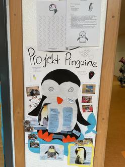 Im Flur gestalteten wir ein Plakat. Dieses „wuchs“ mit jeder neuen Information oder Aktivität zu unserem Pinguinprojekt. Das Plakat „Pinguin“ lud Klein und Groß zum Schauen, Lesen und Verweilen ein.
