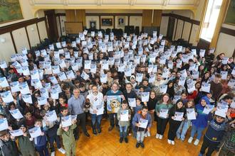 Nach der Verteilung der Urkunden und Preise ging es in die Aula zum Gruppenfoto. Die Schulgemeinschaft beglückwünscht alle Schüler für ihre hervorragenden Leistungen und dankt den Lehrkräften, die unter der Federführung von Informatiklehrer Patrick Dreher jährlich die Durchführung der Informatik-Wettbewerbe ermöglichen.