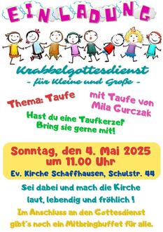 | SCH | 11:00 Uhr | Krabbelgottesdienst für Kleine und Große, mit Taufe von Mila Gurczak, anschl. Mitbringbuffet |