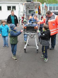 Ganz schön aufgeregt waren die Kinder, als auf einmal ein Rettungswagen und ein Einsatzwagen des DRK auf dem Parkplatz der Kita standen. Diese wurden von den Kindern auch sofort unter die Lupe genommen. Die Kinder hatten viele Fragen, die von Herrn Laurent beantwortet wurden. Herr Laurent zeigte und erklärte ihnen die verschiedenen Schrankinhalte und Materialien, z.B. ein Pulsoxymeter, einen Beatmungsbeutel, ein Blutdruckmessgerät und vieles mehr. Anschließend erklärte er den Kindern die Funktion der Trage. Wer sich traute, durfte auch mal Probeliegen, Anschnallen und mit der Trage raus aus dem Rettungswagen und wieder rein. Weiter ging es zum Einsatzfahrzeug des DRK Differten.