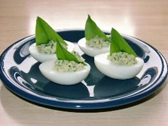 Hierfür brauchen Sie an Zutaten: mehrere hartgekochte Eier, mindestens doppelt so viele Bärlauch-Blätter, Mayonnaise, Senf und etwas Salz