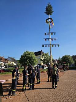 Tatkräftige Unterstützung erhielten die Feuerwehrleute von Jörg Klein und Marius Frey, die mit ihren Traktoren, einer Hebebühne und einer Seilwinde dafür sorgten, dass das Aufstellen des Baumes sicher verlief. Unter dem Beifall zahlreicher Zuschauer wurde der geschmückte Maibaum schließlich aufgerichtet.