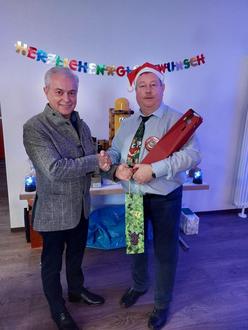Beigeordneter Jürgen Fäh mit Wehrführer Guido Hübschen (60) im Nikolaus-Look