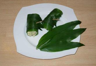 Zubereitung: Legen Sie die 6 größeren Bärlauchblätter zunächst zur Seite. Schneiden Sie das Ei und die 5 mittleren Bärlauchblätter in kleine Stücke. Geben Sie dieselben mit der Creme Fraîche, dem Senf und den übrigen Gewürzen in eine Schüssel und vermengen Sie das Ganze. Legen Sie nun 1 der größeren Bärlauchblätter auf Ihre Arbeitsplatte und 2 weitere mittig darauf.