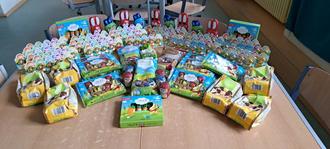 Saisonale Weihnachts- und Osterartikel, die noch lange haltbar sind, aber eben nicht mehr bis zum nächsten Fest, entsorgen? Nein, wenn man doch damit knapp 160 Kinder glücklich machen kann. Diesen wundervollen Gedanken hatte Frau Nadine Maier, Filialleiterin des Rewe Marktes, hier in Wadgassen.