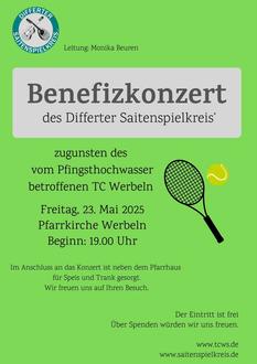 Wir freuen uns bekannt zu geben, dass der Differter Saitenspielkreis sich bereit erklärt hat, zugunsten des, vom Pfingsthochwasser 2024 so stark betroffenen Tennisclub Werbeln ein Benefizkonzert in der Werbelner Pfarrkirche St. Antonius durchzuführen.