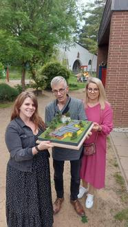 Ein haargenaues Modell von der Kita mit Kapelle spendet Bernhard Wernicke zur Versteigerung auf dem 50 Jahre Kita Fest am 3. und 4. Juni. Der Erlös wird dem Kindergarten zu Gute kommen. Die Übergabe des Modells zur Versteigerung erfolgte bei der Leiterin der Kita Stella Linnenberger.