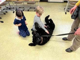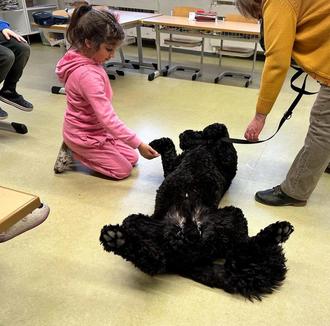 An Montagen bleiben die Erstklässler unter sich und dürfen sich eine von drei Neigungsgruppen aussuchen. In der Schulhund-Neigungsgruppe lernen die Kinder die Körpersprache von Hunden kennen und üben, wie man sich in der Gegenwart eines Hundes verhalten sollte. Das hat unter anderem einen präventiven Sicherheitsaspekt für die Kinder.