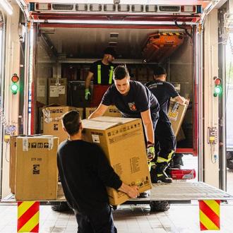Einsatzkräfte der Freiwilligen Feuerwehr bei der Auslieferung der Trocknungsgeräte