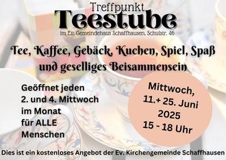| Teestube – Nachmittagstreff für alle Menschen | – Jeden 2. und 4. Mittwoch im Monat von 15:00 bis 18:00 Uhr geöffnet. Nächste Termine: Mittwoch, 11. + 25. Juni 2025. |