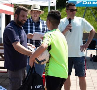 Ein Schüler mit Schulleiter Ralf Frank, stellvertretendem Schulleiter Philipp Schmidt und Sportlehrer Alexander Stamm bei der Übergabe der Urkunden