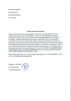Anlässlich des Brunnenfestes im Gemeindebezirk Schaffhausen wird gemäß §§ 44 und 45 der Straßenverkehrsordnung vom 6.03.2013 (BGBI. I. S. 367) in der zur Zeit geltenden Fassung in Verbindung mit Artikel 1 Teil 3 § 11 des Straßenverkehrszuständigkeitsgesetzes vom 13.6.2001 (Amtsblatt S. 1430) die Kirchstraße ab Donnerstag, dem 26.06.2025 Uhr bis zum Montag, dem 30.06.2025 12.00 Uhr für den Gesamtverkehr gesperrt. Ebenso wird die Straße „Am Brunnen" ab Abzweigung Tucherbachstraße bis zur Dresdenerstraße von Donnerstag, dem 26.06.2025 bis Montag, dem 30.06.2025 12.00 Uhr für den Gesamtverkehr gesperrt. Die Straße „Am Hänsengarten" wird von Donnerstag, dem 26.06.2025 bis Montag, dem 30.06.2025 12.00 Uhr gesperrt. Der Anliegerverkehr bleibt ausgenommen. Die Umleitung erfolgt über die innerörtlichen Straßen. Die Zufahrt für Einsatz- und Rettungsfahrzeuge muss jederzeit gewährleistet sein. Diese verkehrspolizeiliche Anordnung tritt nach dem Aufstellen der Verkehrszeichen in Kraft.