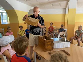 Herr Kollmann kam zu uns in die Schule und brachte mehrere Utensilien mit, die wir nicht kannten. Zum Glück zeigte er uns aber später für was wir diese Sachen benötigen werden. Zuerst möchten wir euch jedoch noch erzählen, wie die Bienen den Honig herstellen. Natürlich wussten einige Kinder von uns das schon, denn wir haben schon Herr Kollmanns Bienen bereits besichtigt und somit auch schon einiges über diese gehört. Bei dieser Gesprächsrunde hatten wir die Möglichkeit generell Fragen zum Thema Bienen zu stellen. Hiervon hatten wir natürlich jede Menge, denn wann hat man schon die Gelegenheit einen solchen Bienenexperten genauer zu fragen? Wir erfuhren, dass die Bienen super wichtig sind, denn ohne die Bienen gibt es keine Bestäubung, dann haben wir Menschen kein Obst mehr. Stellt euch mal vor es gäbe keine Erdbeeren mehr. Das wäre echt eine Katastrophe für uns. Und wusstest ihr, dass eine Biene um ein Glas Honig zu produzieren 3,5 Mal um die Erde fliegen muss? Wir wussten das nicht und waren auch kurz geschockt.