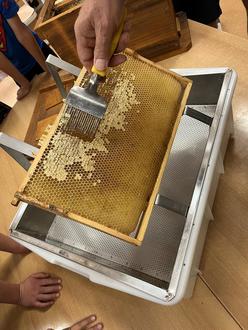 Zum Glück hatte Herr Kollmann einen Trick, denn von alleine kamen wir nicht darauf. Zuerst brauchte man ein Teil (Entdeckelungsgabel), das aussah wie ein Schaber. Damit wurde das Äußere der Wabe abgekratzt (entdeckelt). Stellt euch mal vor, das Wachs konnte man sogar essen. Habt ihr das schon einmal probiert? Es hatte die Konsistenz von einem Kaubonbon und schmeckte nach Honig. Danach kamen die Waben in die Honigschleuder. An dieser musste man einen Griff drehen und anschließend floss der Honig aus den Waben in einen Behälter. Also drehten wir so lange, bis die Waben leer waren. Ihr glaubt gar nicht, wie viel Honig da heraus kam, nämlich ganz schön viel. Nun mussten wir nur noch den Honig vom Behälter in die Gläser füllen. Hättet ihr gewusst, dass dies so gemacht wird? Wir waren davon ziemlich begeistert, denn wir hatten uns das nicht so vorgestellt.