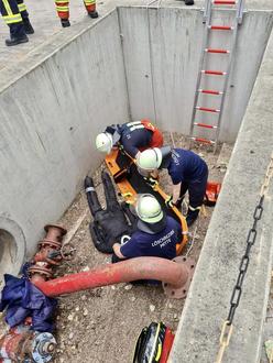 Station 2 - Tiefbauunfall: Eine Person ist in Baugruben gestürzt, die Rettung erfolgte über die schiefe Ebene.