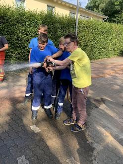 Danach bauten wir eine Spritzwand auf und alle durften mit dem Feuerwehrschlauch versuchen die Öffnung in der Mitte zu treffen.