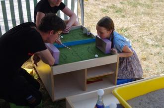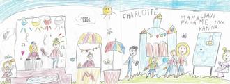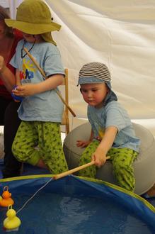 Lange haben Kinder, Eltern und Fachkräfte unserer Kita auf diesen Tag hin gefiebert. Es wurden Tänze geübt, Fahnen gebastelt, Essen, Getränke und viele Materialien organisiert und am 17.06.2023 war es dann endlich soweit. Dann feierten wir unser Kita Fest im Zeichen der Sprach- Kita. Um 14.00 Uhr kamen die Kinder mit den Familien an. Um 14.30 Uhr versammelten sich dann alle vor der Bühne. Nach einem Begrüßungslied unseres Kita-Chores, gab es ein kleines Anspiel durch die Fachkräfte. Zuerst waren alle auf der Bühne ganz vergnügt, sangen, tanzten und redeten miteinander. Doch dann kam ein fürchterlicher Wind und wehte alle Buchstaben vom Buchstabenbaum. Dies hatte zur Folge, dass alle Fachkräfte ihre Sprache verloren. Zum Glück meldete sich die Sonne zu Wort und bat alle Kinder und ihre Familien mitzuhelfen, die Sprache der Kita wiederzufinden. Dazu mussten die Kinder an den Workshop-Ständen Aufgaben lösen. Wenn sie erfolgreich waren, haben sie ein Blatt bekommen, welches sie dann zum Sprachbaum brachten. An diesem Tag konnten die Kinder und ihre Familien Sprache in all ihren Facetten erleben: Sie wurden herausgefordert, Enten zu angeln, die Bilder unter sich versteckt hielten. Mit diesen Bildern konnten die Kinder lustige Sätze zusammenstellen. An einem anderen Stand zogen sie Begriffe und stellten sie pantomimisch dar. Es gab auch eine Dosenwurfstation, bei der die Kinder nach dem Umwerfen aller Dosen zwei Bilder zu einem Wort kombinieren mussten. Im Bereich der Mundmotorik konnten die Kinder durch das Pusten von Farbe mit einem Strohhalm lustige Bilder gestalten. Diejenigen mit besonders viel "Puste" konnten sich beim Puste-Fußball messen, wo sie einen Watteball mit Strohhalmen in ein kleines Tor befördern mussten. In einem Dschungelparcours konnten die Kinder Laute der Tiere nachbilden. Im Geschichtenzelt hatten die Teilnehmer die Möglichkeit, sich zurückzuziehen.