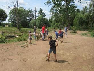 Während dem Spaziergang mussten hier die Kinder ihre Teamfähigkeit unter Beweis stellen, denn die Kinder verteilten sich rechts und links neben den Eseln und mussten darauf achten, dass die Esel in der Mitte blieben. Das war gar nicht so einfach, denn neben dem Weg war so leckeres frisches Gras, welches die Esel gerne fressen wollten. Nach einer längeren Pause auf dem Feld ging es wieder zurück zum Eselzentrum. Dort angekommen wurden zuerst die Esel wieder versorgt und verpflegt. Dann mussten die Kinder das Gelände abäppeln, denn auch das gehört hier zur täglichen Arbeit. Einige Kinder waren direkt zur Stelle und nahmen sich Besen, Schaufel und Schubkarre und fingen direkt mit der Arbeit an. Dabei zeigten die Kinder großes Interesse und große Ausdauer.