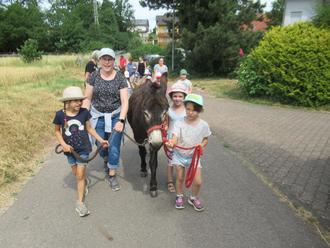 Am Dienstag, 27. Juni fuhren die angehenden Schulkinder nach Heusweiler zum Eselzentrum Neumühle. Dort wurden wir schon herzlich von Katrin Bach erwartet und begrüßt. Bevor es los ging, hat Katrin gemeinsam mit den Kindern über die Verhaltensregeln bei den Eseln gesprochen. Da die Esel nämlich große Ohren und ein super Gehör haben, sollte man sich eher leise verhalten. Nachdem alles Wichtige besprochen wurde ging es endlich los. Nun konnten die Kinder zuerst ihr sportliches Können zeigen. Denn es war ein großer Parcours aufgebaut, zum Slalom laufen, springen, hüpfen, schwingen und Kniebeugen machen. Zuerst absolvierten die Kinder den Parcours gemeinsam, danach jeder einzeln und die Zeit wurde dabei gestoppt. Beim Anfeuern gab jeder sein Bestes. Die Schnellsten brauchten nur 19 Sekunden dafür.