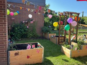 Am Morgen des Eröffnungsfestes wurden mit Hilfe der Hauswirtschaftskräfte Obst und Gemüse in mundgerechte Stücke geschnitten, und auf Spießchen gesteckt, mit selbstgeernteten Schnittlauch aus den Hochbeeten ein Dip gerührt und auch alle anderen Leckereien vorbereitet und angerichtet. Dann ging es nach draußen, um den „Wundergarten“ mit Luftballons, Lampions und Bastelsachen zu dekorieren - soooo schön sieht das aus. Auch das Buffet wurde aufgebaut, die Kinder des Kinderparlamentes hatten sich vorgenommen, die anderen zu bedienen.