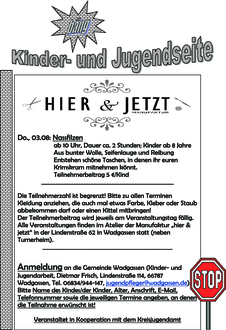 Anmeldung an die Gemeinde Wadgassen (Kinder- und Jugendarbeit, Dietmar Frisch, Lindenstraße 114, 66787 Wadgassen, Tel. 06834/944-147, jugendpfleger@wadgassen.de).