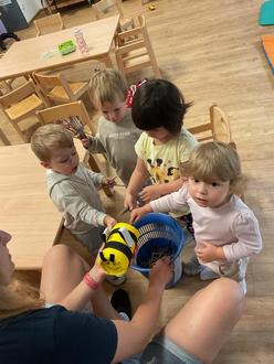 Wie spannend! Plötzlich summt es in unserer Krippengruppe und die Kinder erzählen aufgeregt von einem Tier an unserem Fenster. Mit einem Glas fangen wir es und betrachten es ganz genau. Es ist gelb mit schwarzen Streifen und hat Flügel – eine Biene!!!