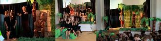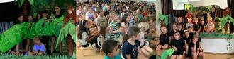 Frau Feid aus dem sozialpädagogischen Bereich der Schule hatte - diesmal mit Unterstützung von Herrn Wolf - wieder einmal keine Mühen gescheut und mit den Kindern zusammen nicht nur die Texte und Lieder, sondern auch eine mitreißende Choreographie einstudiert; außerdem mit viel Einfallsreichtum und Kreativität ein bezauberndes Bühnenbild geschaffen, das alle kleinen und großen Zuschauer direkt mit Beginn des Stückes mitten in den Dschungel hineinzauberte… bzw. ins Dschungelbuch. Und darum ging es auch: um den kleinen Mogli, der im Dschungel von einer Wolfsfamilie großgezogen wurde und einige spannende Abenteuer zu bestehen hatte, bevor er für sich den passenden Platz im Leben finden konnte.