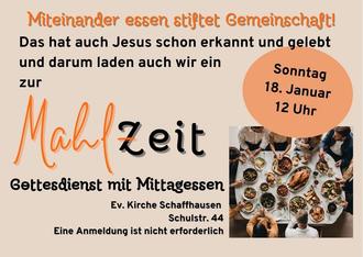 | SCH | 12:00 Uhr | MahlZeit Gottesdienst mit Mittagessen, Ira Köhler |