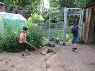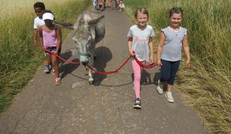 Am Donnerstag, 23. Juni fuhren die angehenden Schulkinder nach Heusweiler zum Eselzentrum Neumühle. Dort wurden wir schon herzlich von Katrin Bach erwartet und begrüßt. Bevor es los ging, hat Katrin gemeinsam mit den Kindern über die Verhaltensregeln bei den Eseln gesprochen. Da die Esel nämlich große Ohren und ein super Gehör haben, sollte man sich eher leise verhalten. Nachdem alles Wichtige besprochen wurde ging es endlich los. Zuerst mussten die Kinder das Gelände abäppeln, denn auch das gehört hier zur täglichen Arbeit. Einige Kinder waren direkt zur Stelle und nahmen sich Besen, Schaufel und Schubkarre und fingen direkt mit der Arbeit an. Dabei zeigten die Kinder großes Interesse und große Ausdauer. Auch war hier Teamfähigkeit gefragt. Denn einer kehrte und der andere hielt die Schaufel.
