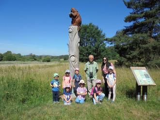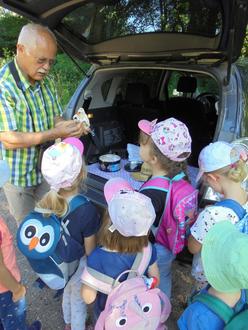 Herr Kollmann erzählte den Kindern viel Neues über die Flora und Fauna des Naturschutzgebiets Eulenmühlenpfad und konnte jede Frage beantworten, die die Projektgruppe in Bezug auf die Pflanzen -und Tierwelt stellte. Besonders spannend und interessant fanden die Kinder die Geschichten über den Lebensraum der Biber, die sich dort wieder ansiedelten. Herr Kollmann setze während der ganzen Wanderung viele Impulse, welche die Kinder zum Nachdenken und Diskutieren anregten und somit ihr Interesse im Bereich der Natur und Umwelt noch mehr weckten. Wir bedanken uns herzlich bei Herrn Ernst Kollmann für seine Unterstützung und erlebnisvolle Zeit.