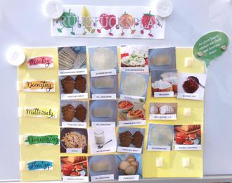 Am selbstgestalteten Frühstücksplan an der Informationstafel im Eingangsbereich können Kinder und Eltern morgens das Frühstücksangebot nachlesen. Dieser Frühstücksplan besteht aus Fotos der Lebensmittel die beim Frühstück angeboten werden. Die pädagogischen Fachkräfte legen die Bildkarten der vorhandenen Lebensmittel für die kommende Woche freitags bereit und laden im Anschluss einige Kinder zum Gestalten des Planes ein. Hier können sich auch schon die Kleinsten, die sich noch nicht sprachlich mitteilen können, mit einbringen, indem sie auf die Bilder zeigen. Die Kinder haben diese neue Art von Frühstücksplanvorbereitung sehr gut angenommen und zeigen viel Interesse an die Heranführung an gesunde und abwechslungsreiche Ernährung. Stolz zeigen sie ihren Eltern an der Moderationswand, wenn sie nachmittags abgeholt werden, dass sie den Plan mitgestalten und ihre Ideen und Wünsche mit anbringen durften.
