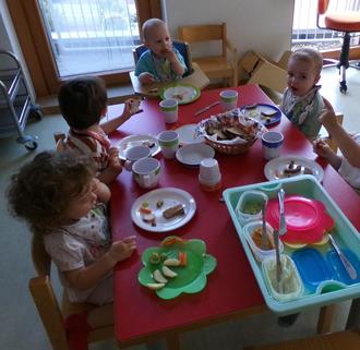 Seit einigen Monaten haben sich die Pädagogischen Fachkräfte der Krippe Pfiffikus Gedanken um die Umsetzung und Verbesserung des Frühstücksangebotes für Kleinkinder gemacht. Nach dem Besuch von zwei der Fachkräften an informativen Fortbildungen zum Thema „Gesunde Ernährung für Kinder unter drei Jahre“, wurde, im Rahmen des Qualitätsentwicklungsprozess der Krippe, die Thematik in den Mittelpunkt gestellt. Die Mitarbeiterinnen haben sich Gedanken, um mögliche Lebensmittelalternativen zu fettreichen und zuckerhaltigen Lebensmitteln gemacht, laut DGE-Qualitätskriterien. Nach diesen Richtlinien wurde letztlich das Angebot, im Rahmen des Frühstücksbüffets, angepasst. Zum Beispiel wurde Wurst ersetzt durch gesunde Gemüseaufstriche, Butter die viel tierische Fette enthält, wurde durch Margarine getauscht und das Angebot zum Picknick am Nachmittag wurde mit mehr selbstgemachten Backwaren wie beispielsweise Bananen-Waffeln ohne Zucker ergänzt. Als Snack und für alle Zwischenmahlzeiten bleiben Obst und Gemüse der Saison natürlich die erste Wahl.