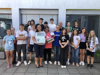 Zum Abschluss des Projekts überreichten Herr Achim Dellwo vom Jugendtierschutzteam Dillingen als Vertreter des Deutschen Tierschutzbundes und Frau Simone Hinnüber, Leiterin des Gnadenhofes, der Projektgruppe eine Patenschaftsurkunde für die Ziege Fee. Diese Patenschaft ist ein Geschenk des Deutschen Tierschutzbundes. Im Gegenzug überreichten die Schülerinnen und Schüler und ihre Lehrerinnen die am Schulfest gesammelten Spenden in Höhe von 200 € an die Pferde- und Ziegenalm. Alle Beteiligten waren vom Projekt begeistert und planen mit einer Wiederauflage in der nächsten Projektwoche und mit einem auch außerschulischen Zusammenwirken darüber hinaus.