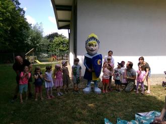 Am Freitag, dem 23. Juni `23 endete das Wanderprojekt „Let`s go Kids“ in Kooperation mit der BKK Pfalz, der Wanderführerin Qiuyu Becker und dem Deutschen Wanderverband, wofür unsere Kita zertifiziert wurde. 11 Kinder im Alter zwischen 4 und 5 Jahren nahmen an dem achtmonatigem DWV-Projekt „Let`s go Kids“ teil und erhielten zum Abschluss ihr Bronze Wanderabzeichen. Voraussetzung für dieses Abzeichen waren insgesamt 10 Wanderungen, davon 5 mit der Wanderführerin Qiuyu Becker und 5 selbst organisierte Wanderungen der Kita. In dem Projekt ging es darum, das Interesse an der Bewegung in der Natur zu wecken. Die Kinder erfuhren was es alles in der Natur zu entdecken gibt und lernten Spielmöglichkeiten kennen, um eine Wanderung abwechslungsreich zu gestalten. Diese Erfahrungen konnten auch die Eltern bei unserer Abschlusswanderung sammeln. Und so lief unser Nachmittag ab. Wir trafen uns alle auf der Wiese hinter dem Dorfgemeinschaftshaus in Friedrichweiler. Alle waren sehr aufgeregt, da uns heute Ritter Palatino besuchen würde. Nachdem alle Picknickdecken ausgebreitet waren und es sich die Familien gemütlich gemacht haben, begrüßte uns Frau Qiuyu Becker. Sie fragte, ob wir nun bereit wären Ritter Palatino zu treffen. Natürlich waren wir das! Gemeinsam riefen wir seinen Namen. Dann war es so weit, Ritter Palatino kam zu uns auf die Wiese. Er überreichte jedem Kind eine Urkunde und eine Wandernadel und der Kita ihr Zertifikat zur Wander-Kita. Nachdem wir noch ein gemeinsames Foto gemacht haben, ging es auf zu unserer letzten Wanderung mit den Eltern.