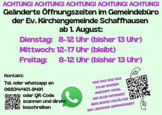 | SCHAFF | Ev. Kirche Schaffhausen, Schulstr. 44, 66787 Schaffhausen |