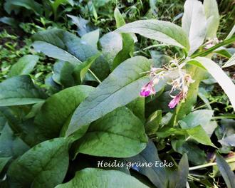 Die Blätter von Comfrey oder auch Beinwell genannt, enthalten viel Eiweiß, Schleimstoffe und Kali. Die angesetzte Jauche beginnt nach 3-4 Tagen schleimig zu werden, nach ungefähr einer Woche ist sie gebrauchsfertig.