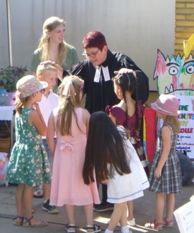 Die Pastorin Ira Köhler hielt einen Wortgottesdienst, der ganz im Zeichen unseres Farbmonster-Projektes stand. Verschiedene Farben symbolisieren die Gefühle (z.B. gelb steht für Freude, blau für Traurigkeit, grün für Gelassenheit, schwarz für Angst,…), die auch die Kinder fühlen, wenn sie an die bevorstehende Einschulung denken. So äußerten sie ihre Gedanken und erzählten auch, worauf sie sich sehr freuen, aber auch, wovor sie sich etwas fürchten.