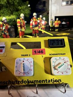 Bereits auf Anfahrt rüstete sich der Angriffstrupp mit Atemschutzgeräten aus. Als wir am Einsatzort eintrafen, sahen wir schon die dunklen Rauchwolken aus den Fenstern aufsteigen. Der Eigentümer berichtete uns, dass sich niemand mehr im Gebäude befindet und zeigte uns den Zugang zum Keller. Sofort bauten wir einen Löschangriff auf und der Angriffstrupp ging zum Innenangriff vor. Währenddessen rüstete sich der Wassertrupp als Sicherheitstrupp mit Atemschutz aus. Im Verlauf des Einsatzes standen insgesamt noch vier weitere Trupps unter Atemschutz bereit.