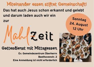 | ÜB | 12:00 Uhr | MahlZeit-Gottesdienst mit Mittagessen |