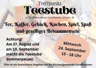 | Teestube – Nachmittagstreff für alle Menschen | – Jeden 2. und 4. Mittwoch im Monat von 15:00 bis 18:00 Uhr geöffnet. Nächster Termin: 24. September. Bitte beachten: Am 27. August und 10. September macht die Teestube Sommerpause. |