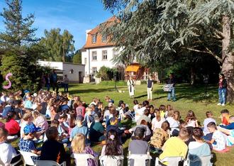 Schönstes Wetter und beste Laune: Die Übergabe der Spielzeugkisten durch den Vorstand des Fördervereins bei der Einschulungsfeier im Pfarrgarten